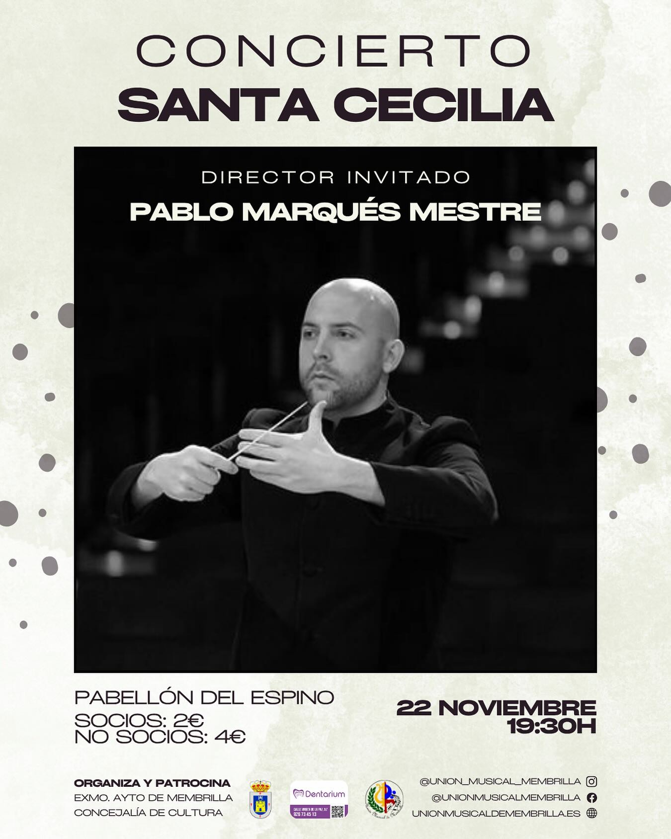 “El concierto de Santa Cecilia, como es habitual en nuestra formación, será dirigido por un director invitado. Este año será Pablo Marqués Mestre, titulado superior en Dirección de Orquesta, director de la Orquesta Sinfónica de Castellón y profesor de dirección de orquesta del Conservatorio Superior de Castellón , siendo uno de los directores españoles de mayor proyección de los últimos años.”