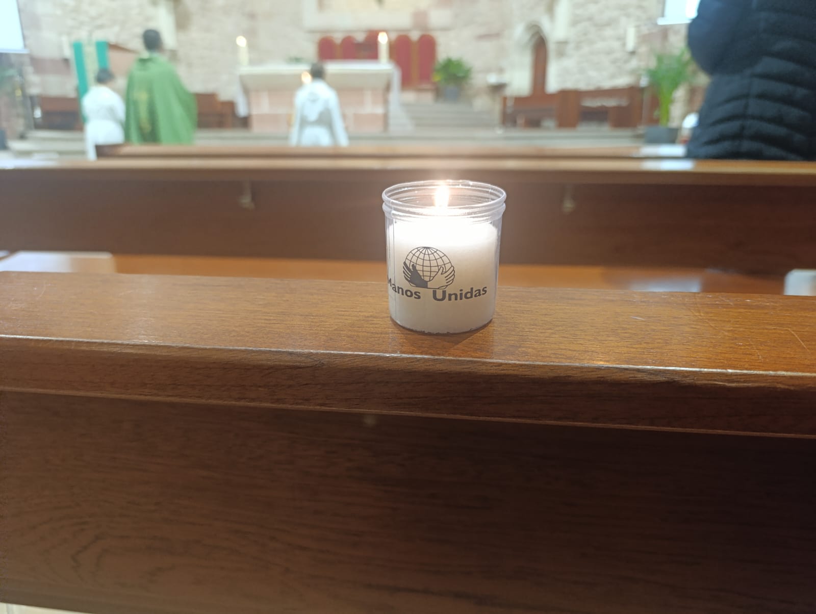 Las voluntarias de Manos Unidas repartieron alrededor de 550 velas a la entrada del templo.