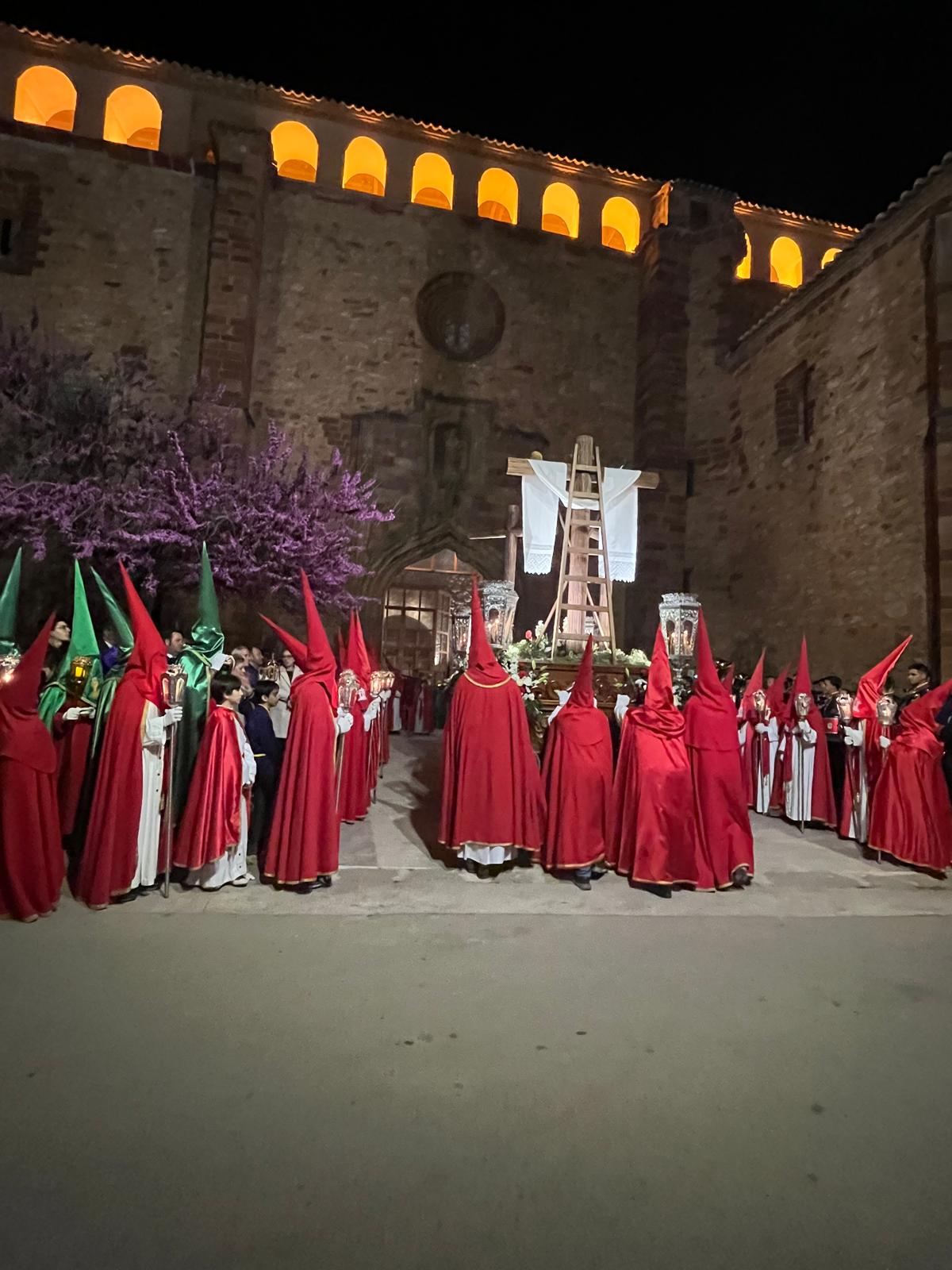 La Hermandad de la Santa Verónica portaba en hombros a su titular Cristo Crucificado y la Hermandad de San Juan Evangelista ponía en la calle el paso de La Piedad y, de nuevo, a su titular San Juan. La Cofradía de la Santa Veracruz y Cristo Resucitado desfila en torno a un Calvario con la Vera Cruz. Tras ella, el solemne paso de Jesús Nazareno Yacente, precedido por el cuerpo de romanos y seguido por las manolas, mujeres de mantilla que desfilaron tras el sepulcro, junto a la Virgen de los Dolores, incorporada no hace muchos años al cortejo.